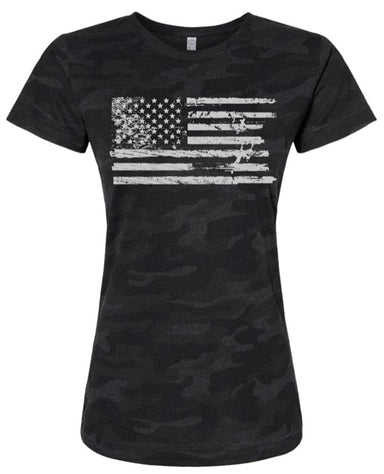 Camo Flag -Unparalleled Comfort and Feel -60/40 Cotton Poly Blend -Pre-shrunk Women's Fit. -Proudly Designed and Printed in Cache Valley, Utah USA